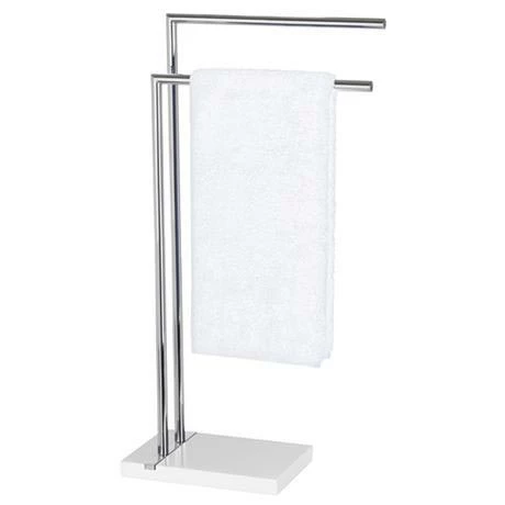 A stylish freestanding towel stand with 2 parallel arms, would make an excellent addition to your modern bathroom. The noble white bathroom range is chracterised by the stylish minimalist design and clear lines. Manufactured from high-grade polyresin with chrome finished detailing. The towel and garment rack offers space for towels and clothes in two stages arranged in parallel running arms. Supported by a heavy rectangular base plate for stability and support.